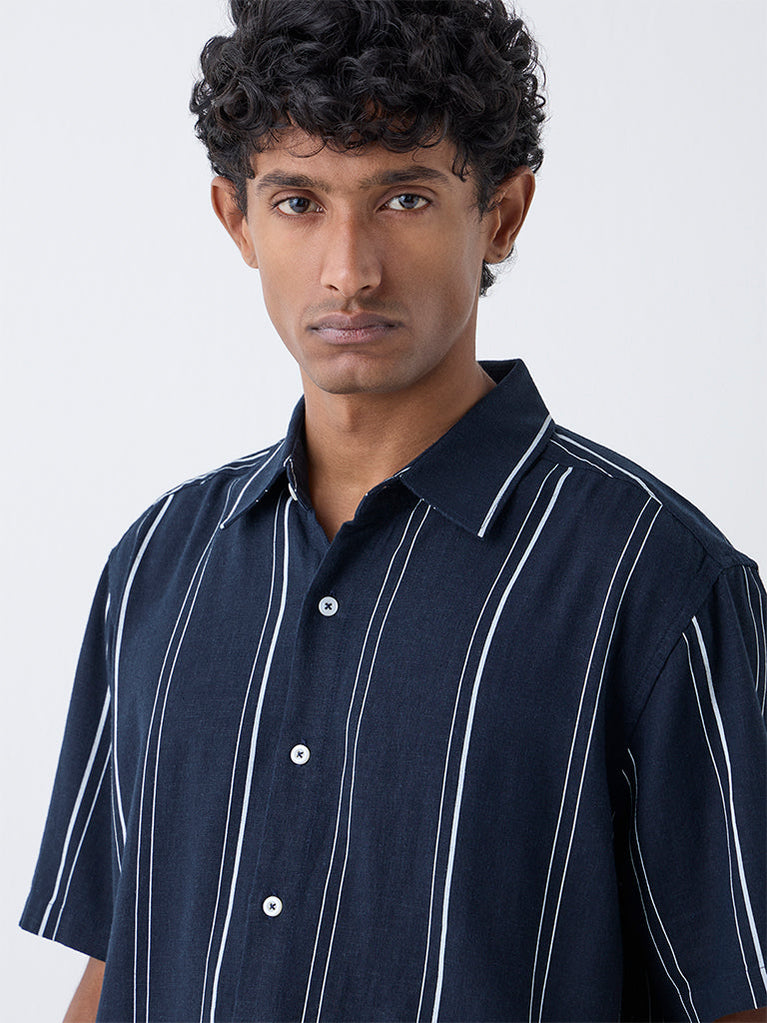 Channel effortless sophistication with this navy shirt from Ascot. Crafted from a breathable linen-blend fabric, it features stripes, a classic collar and short sleeves. The seamless stitch and relaxed silhouette make it perfect for refined, casual occasions.