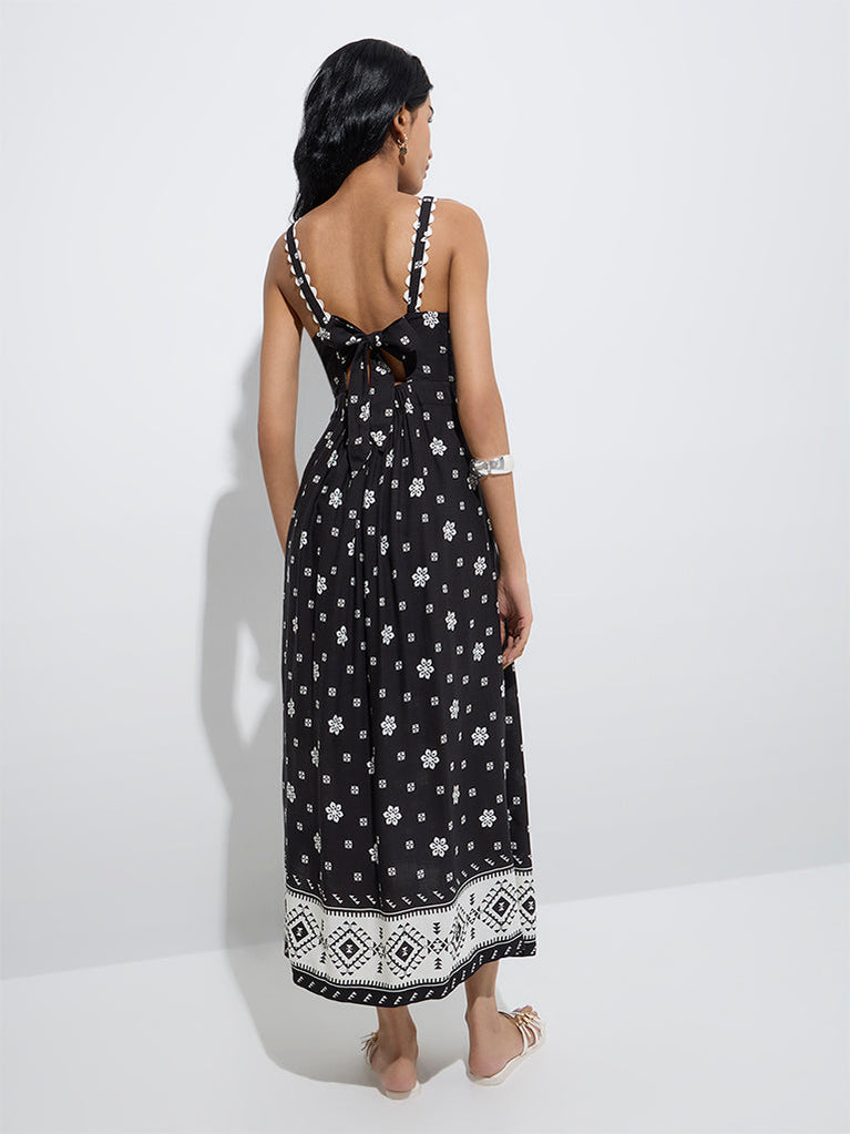 This black A-line dress from Bombay Paisley is adorned with delicate floral motifs for a touch of effortless charm. Spun from a cotton-rich fabric, it features a square neck and geometric-printed shoulder straps, perfect for breezy days with a stylish twist.