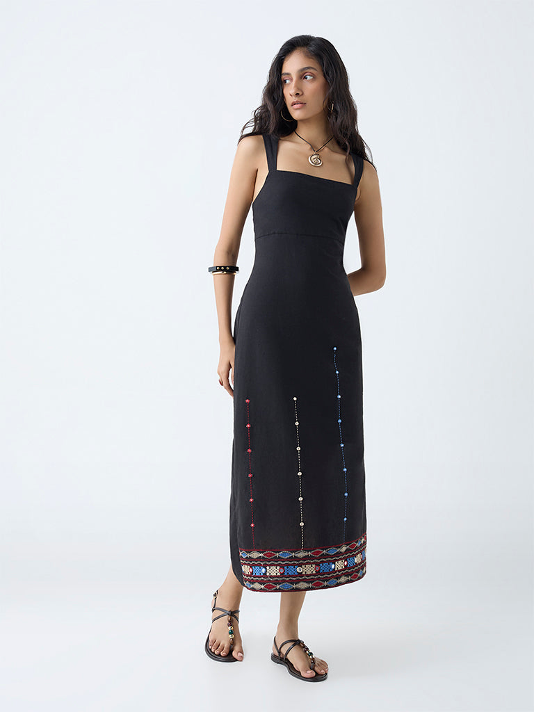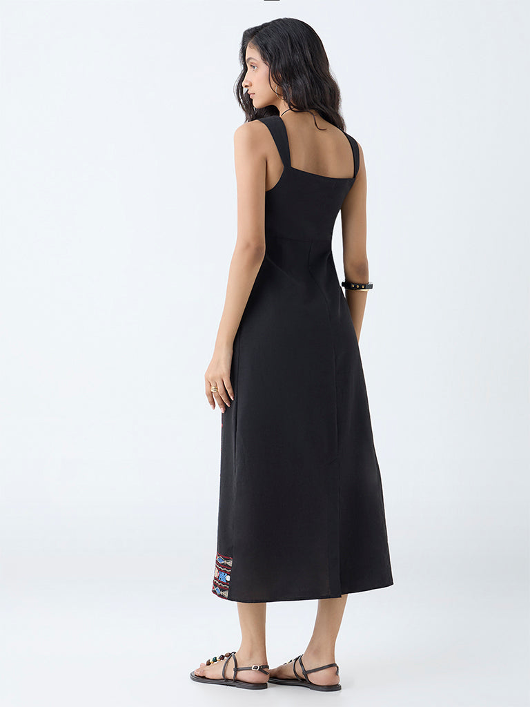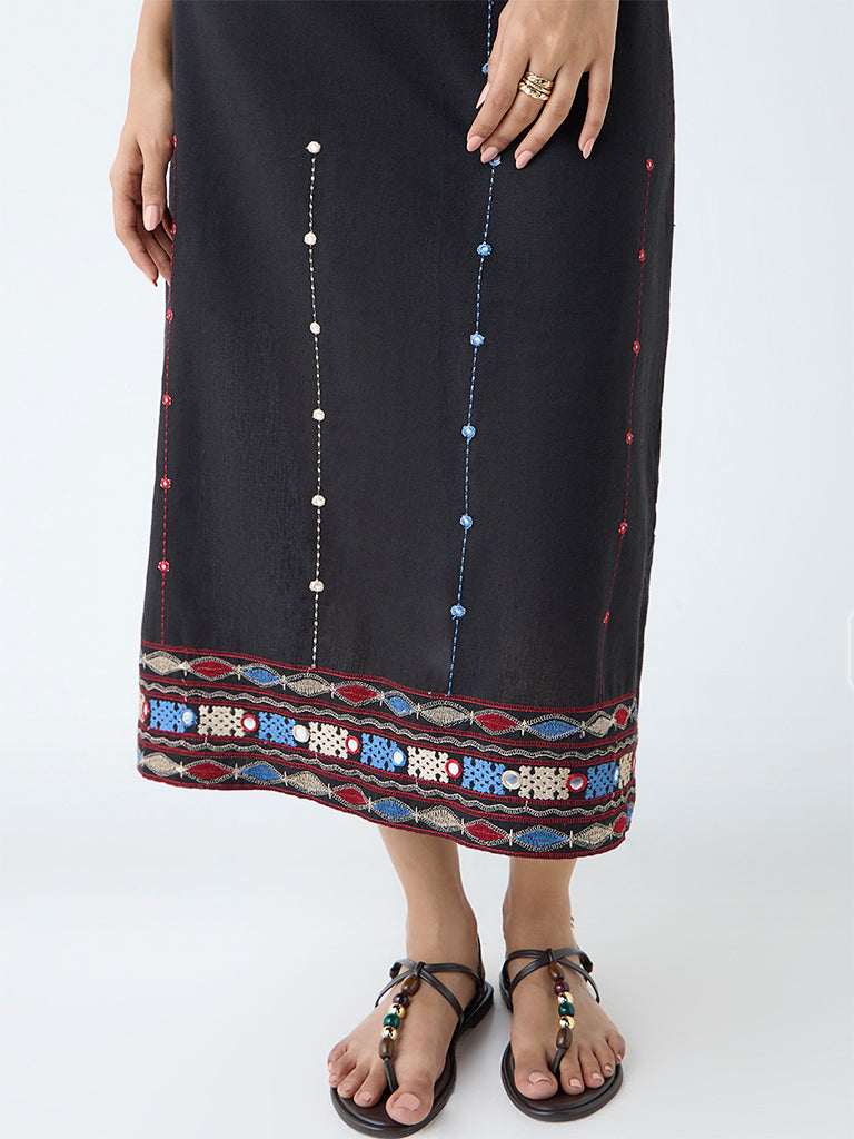 Bombay Paisley Black Embroidered Cotton A-Line Dress