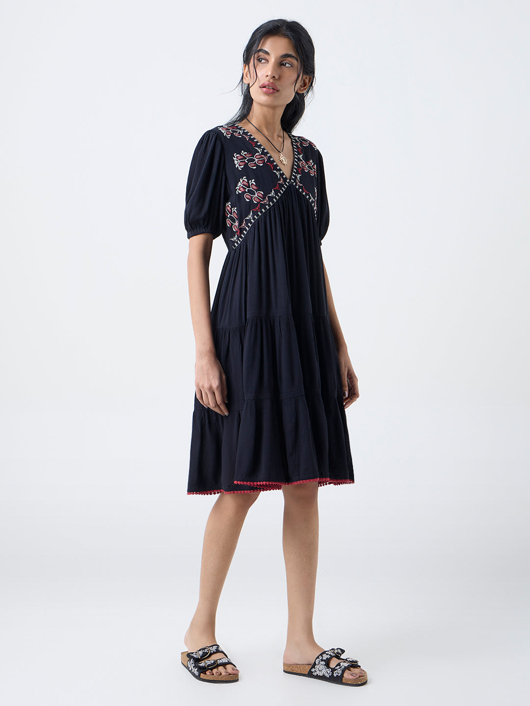 Bombay Paisley Black Embroidered Empire A-Line Dress