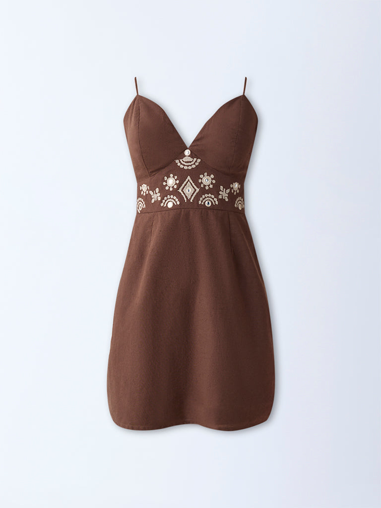 Embody boho charm in your holiday edit with this brown dress from Bombay Paisley. Made from a cotton-rich fabric in a flattering A-line silhouette, it features intricate embroidery on the bodice and playful tie-up straps with tassel details. The plunge neck adds a subtle touch of allure, while a side zipper ensures easy wearability.