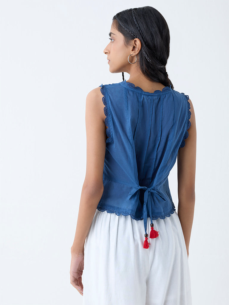 This indigo top from Bombay Paisley will effortlessly elevate your style quotient. Milled from pure cotton for all-day comfort, it flaunts scalloped edges that add a touch of handcrafted charm. The flattering V-neck extends into a buttoned front, while a red tassel tie-up at the back allows you to cinch the waist for a more defined shape.