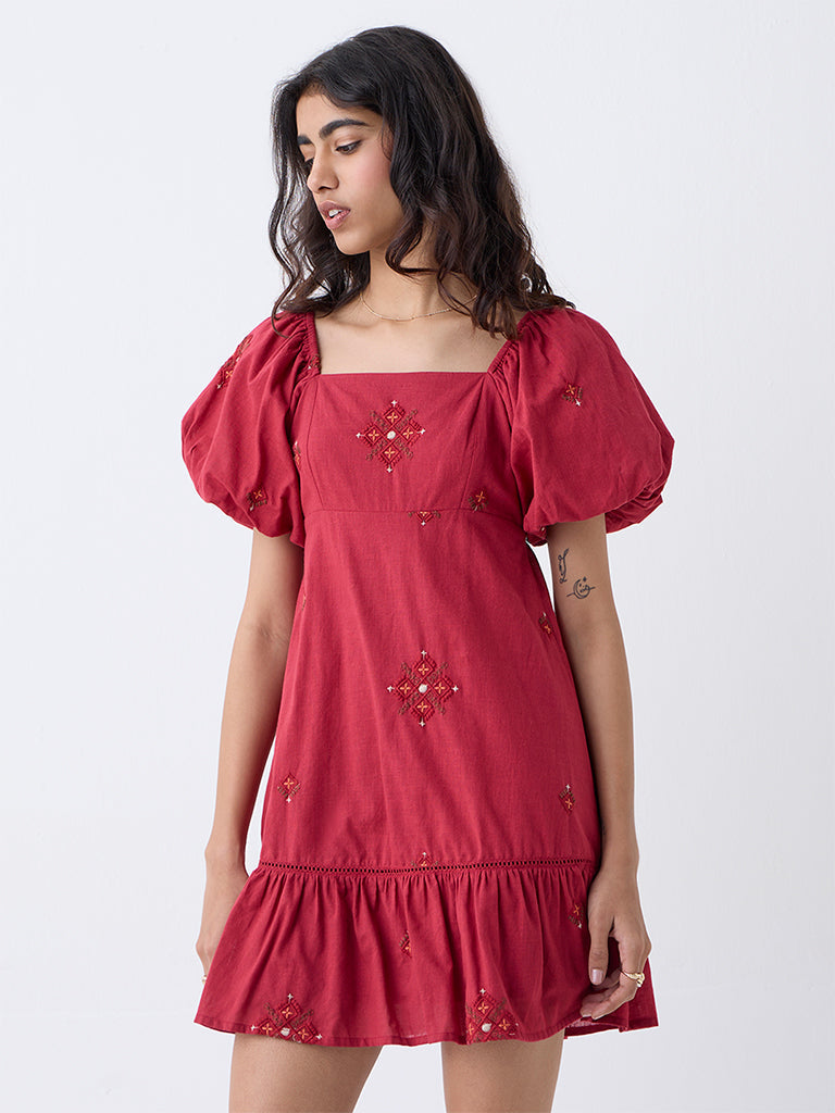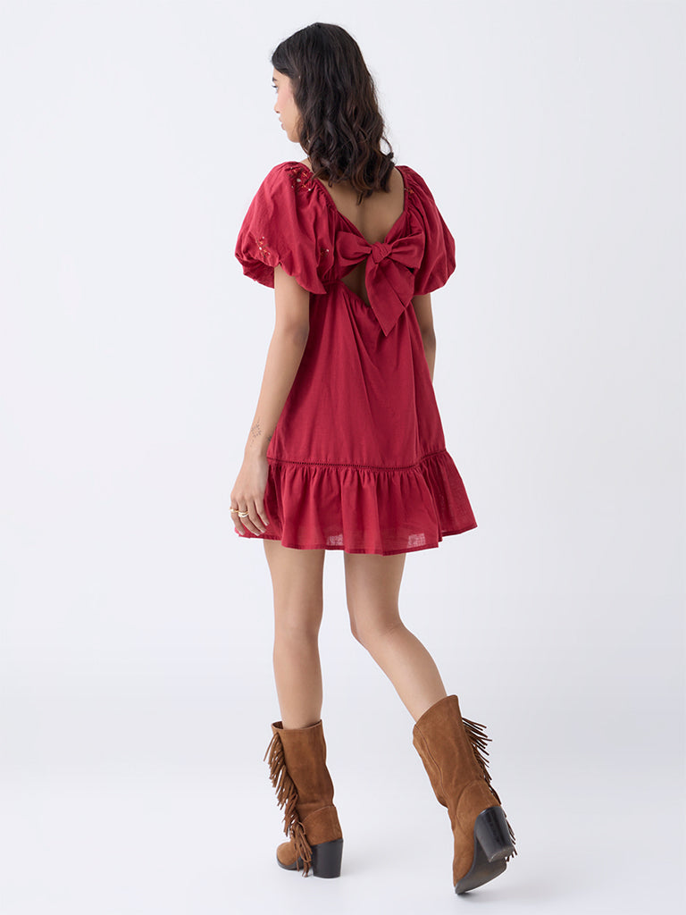 Ideal for brunch plans and open-air gatherings, this maroon dress from Bombay Paisley is detailed with rich embroidery across a fluid A-line silhouette. A square neckline and puff sleeves add volume, while the bow tie-up at the back brings a romantic finish. Made from a cotton-rich fabric, it keeps you comfortable through long outdoor hours.