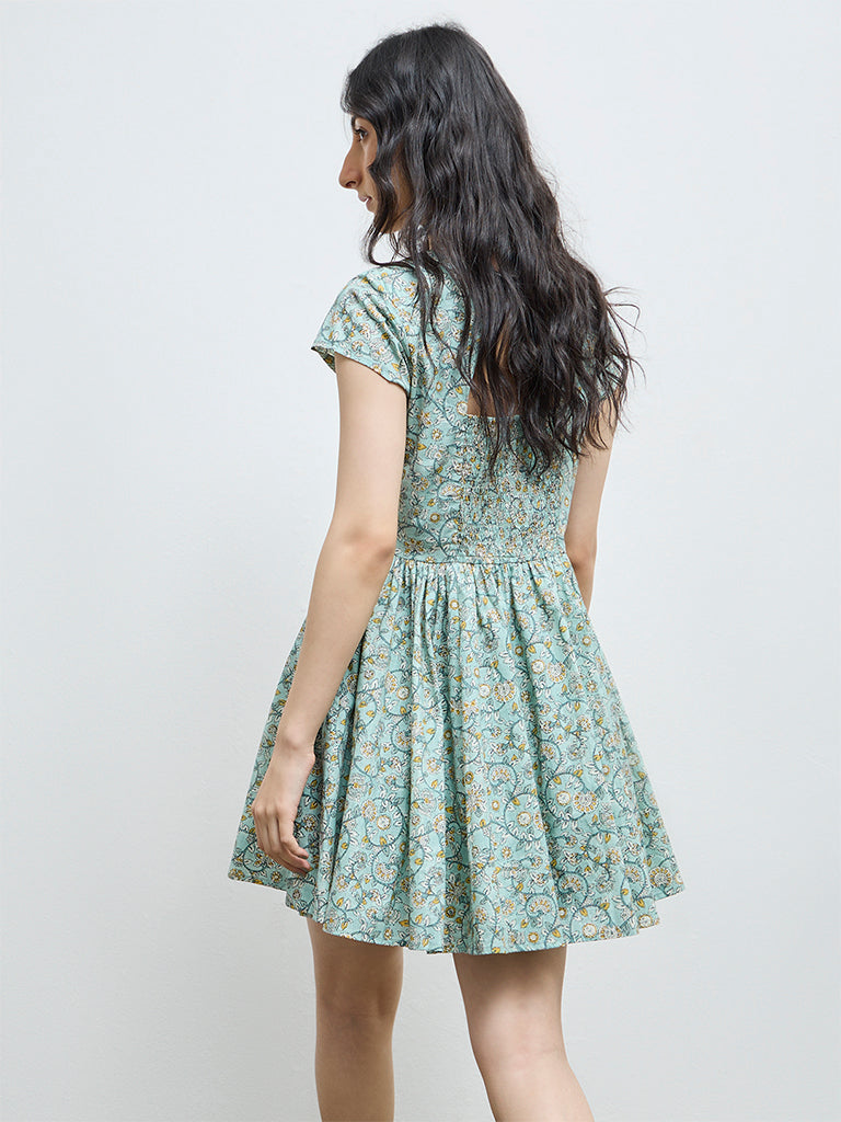 Balance femininity and comfort in this mint dress from Bombay Paisley, patterned with delicate floral motifs. Spun from breathable pure cotton, it features a wrap-style V-neck that flatters the frame, while the smocked back with a cut-out detail offers flexibility. Cap sleeves and A-line silhouette complete the breezy appeal.