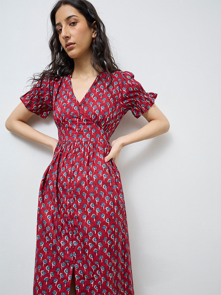 Bombay Paisley presents this red floral printed dress crafted from pure cotton for breathable summer comfort. A deep V-neckline with underbust stitch detailing shapes the fit and flare silhouette. Short sleeves are gently gathered at the cuffs, while imitation buttons add a sleek touch. Finished with side pockets, it blends bohemian charm with chic, everyday appeal.