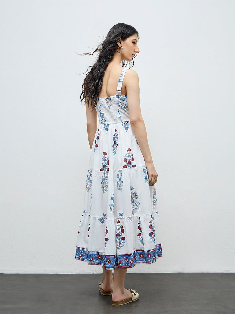 This white dress from Bombay Paisley exhibits vivid floral motifs all over on a tiered silhouette. Build from pure cotton, it carries a scoop-neck, adjustable straps and is completed with smocked back for flexible feel.