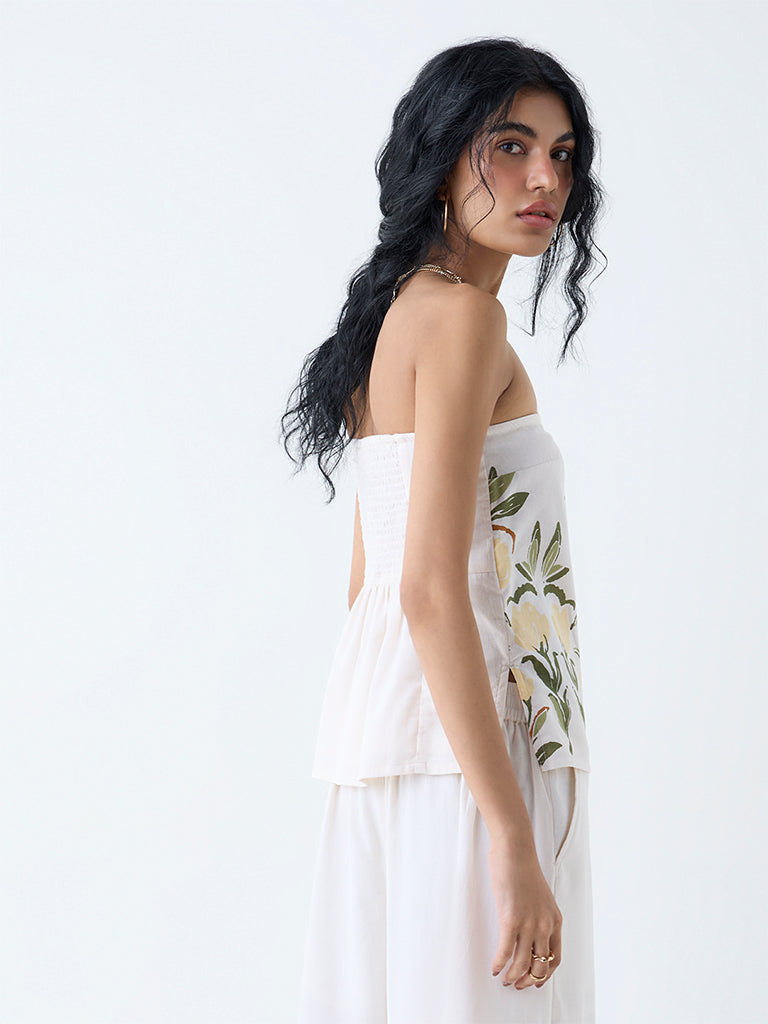 This white tube top from Bombay Paisley is adorned with a lively foliage print. Spun from pure cotton for all-day comfort, it features a smocked back that ensures a flattering fit, making it an easy pick for carefree days out.