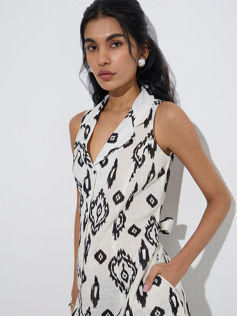 Bombay Paisley White Ikat Printed Cotton Shirt Dress