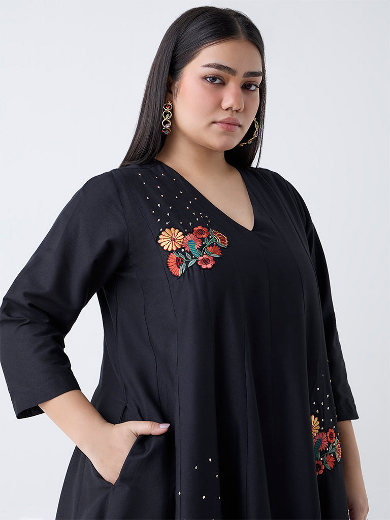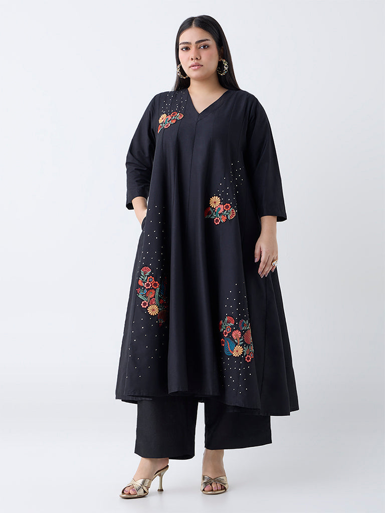Infused with artisanal grace, this black kurta by Diza is detailed with floral embroidery and subtle embellishments for a festive sparkle. The Anarkali silhouette flows elegantly, balanced by a flattering V-neck and three-quarter sleeves. Side pockets add a modern touch of ease to this traditional design.