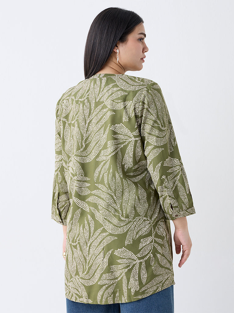 In a soothing hue, this sage tunic from Diza is patterned with leaf motifs for a serene, nature-inspired aesthetic. Milled from a lightweight fabric, it features a notched neck extending to a neat quarter placket and 3/4th sleeves—an ideal choice for understated festive dressing.