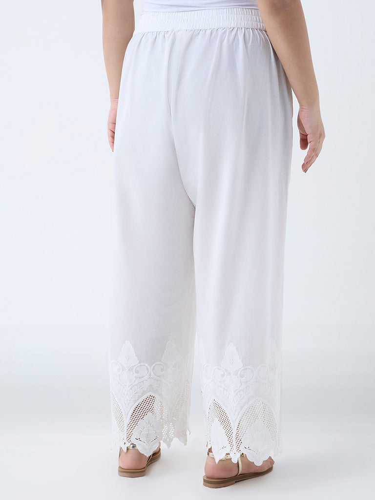 These white ethnic pants from Diza are a versatile staple with elevated accents. Created from a breezy fabric, they flaunt floral embroidery along the hems for a refined finish. An elasticated waistband with drawstring ties ensures comfort, while side pockets add a touch of practicality.
