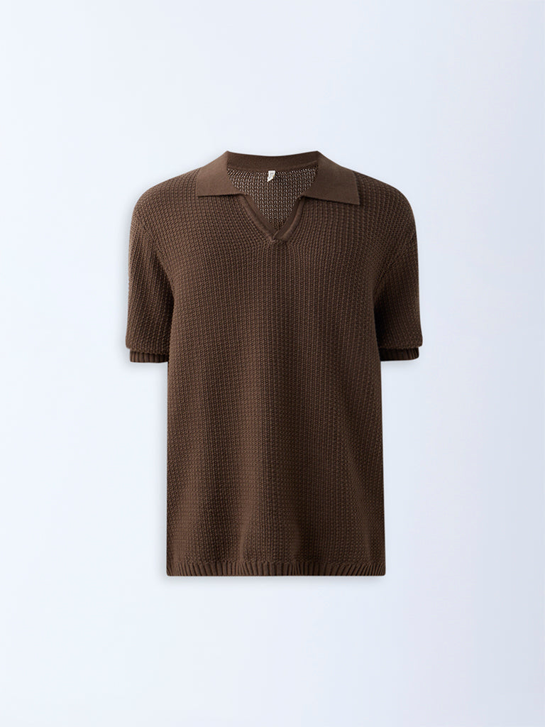 ETA Brown Knit-Textured Relaxed-Fit Polo T-Shirt