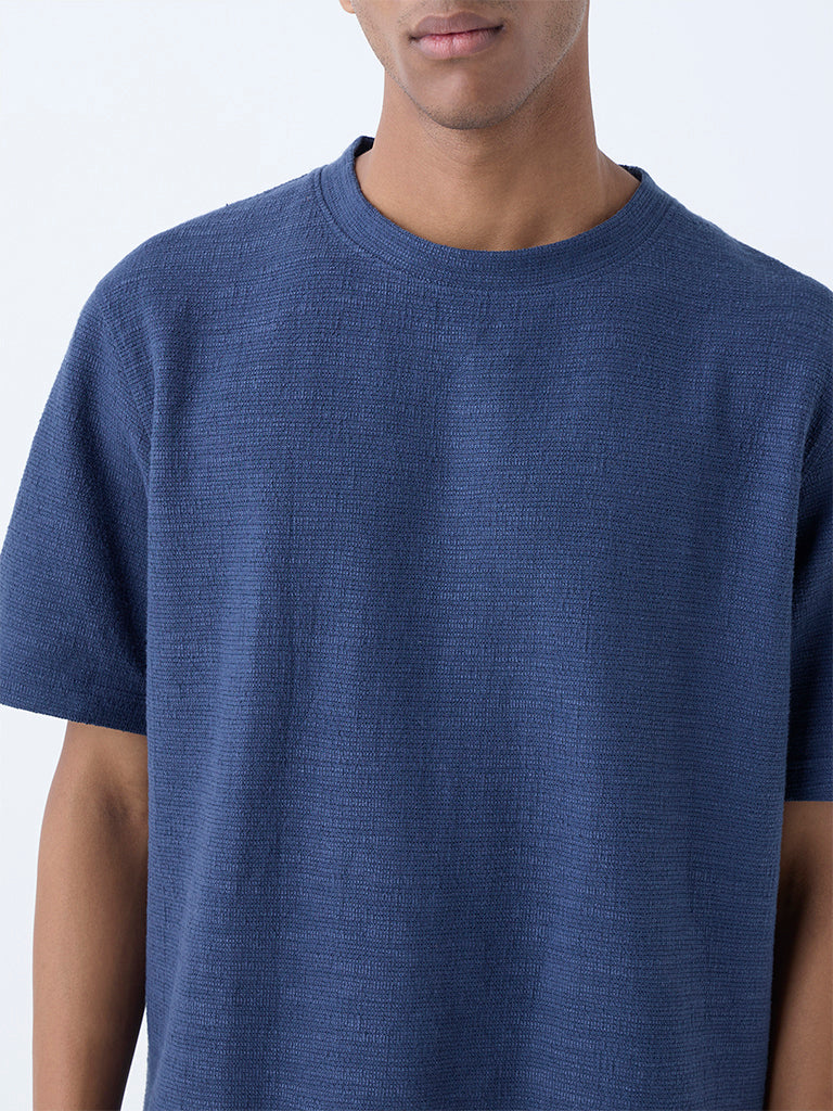 This indigo t-shirt from ETA delivers everyday ease with its soft cotton-blend construction and self-textured finish. Designed with a round neck and short sleeves, it’s a versatile staple that pairs effortlessly with everything from chinos to denim.
