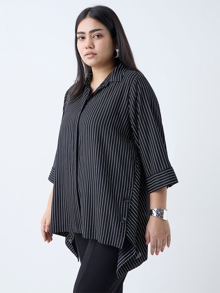 Timeless style meets everyday ease in this black striped blouse from Gia. Tailored from a sumptuous linen-blend fabric, it’s detailed with a classic collar, three-quarter sleeves, and a concealed placket for a polished finish.