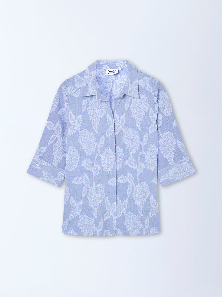 Bring a touch of nature to your wardrobe with this blue shirt from Gia, adorned with elegant botanical prints. Designed with a smart collar, concealed button placket and three-quarter sleeves, it’s a graceful addition to your off-duty style rotation.