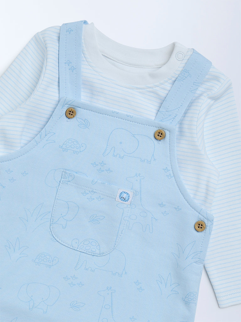 This blue set from HOP Baby is designed for comfortable everyday dressing. The striped cotton t-shirt features a round neckline and full sleeves for gentle coverage, while the dungaree is detailed with playful animal prints, a chest pocket and adjustable shoulder straps. Crafted for ease and movement, this coordinated set blends charm with practical comfort.