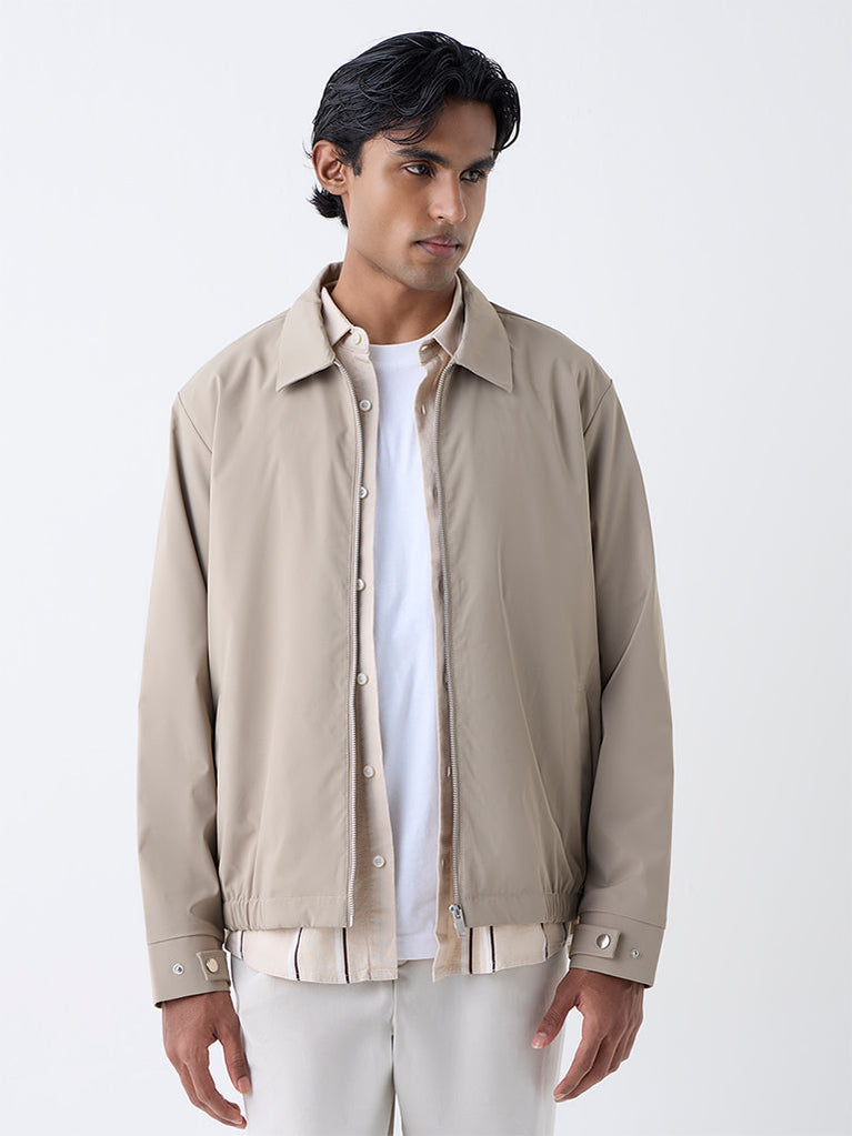 Ascot introduces this beige jacket, sculpted from premium-quality fabric in a relaxed-fit silhouette. It features a spread collar, full sleeves, a zip-up front and kangaroo pockets for a modern finish. A smart outer layer that brings effortless polish to everyday casual looks.