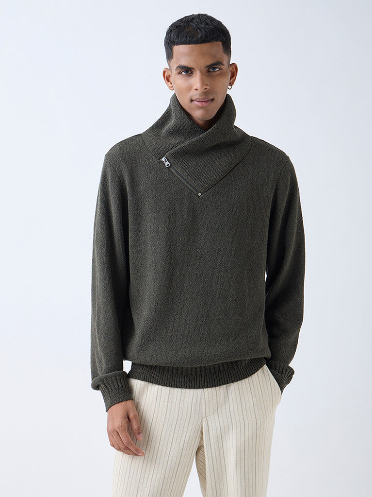 This olive ETA sweater brings textural warmth to colder days. Made from a sumptuous fabric blend, the relaxed fit offers steady comfort without feeling heavy. The shawl collar is finished with an asymmetric zip that adds visual interest, while ribbed trims shape the edges for a neat, grounded finish.