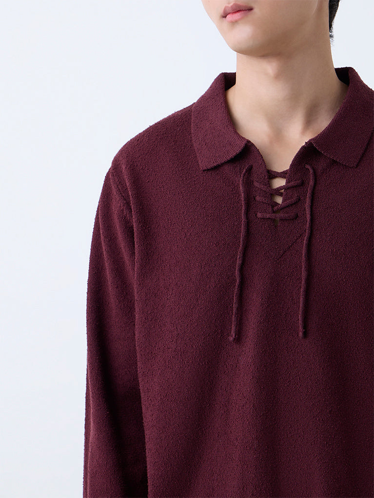 Elevate your winter style with this maroon knit sweater from ETA. Featuring a spread collar with criss-cross drawstrings, it blends comfort with casual sophistication. Finished with ribbed hems and a soft texture, it’s the perfect choice for stylish everyday dressing.