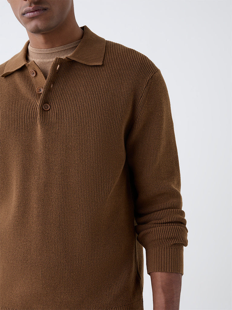 Ascot introduces this tan polo sweater crafted for warmth and day-long comfort. Made from a soft cotton-blend fabric and shaped in a relaxed frame, it features full sleeves, a spread collar, and a quarter button placket. The refined knit texture lends a polished character, making it a sophisticated everyday layer.