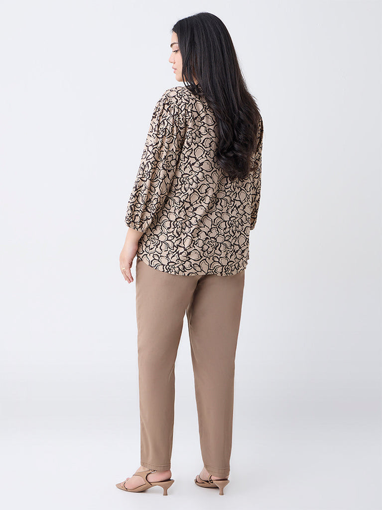 Soft, feminine, and thoughtfully crafted, this brown blouse from Gia features delicate foliage prints that bring gentle character to the silhouette. The sumptuous fabric drapes comfortably, while the V-neckline flows into a concealed button placket for a clean, elongating finish. Three-quarter sleeves complete the look, making it a versatile choice for both work and relaxed outings.
