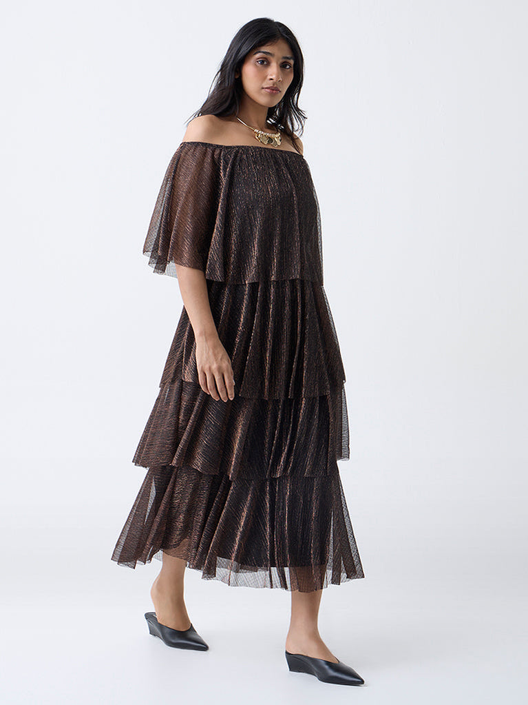 Gia brings a touch of glamour to evening dressing with this black metallic dress. Designed in an A-line silhouette, it features an off-shoulder neckline and short sleeves for a graceful profile. Crafted from lightweight fabric, the tiered ruffle layers move effortlessly, creating a refined yet statement finish.