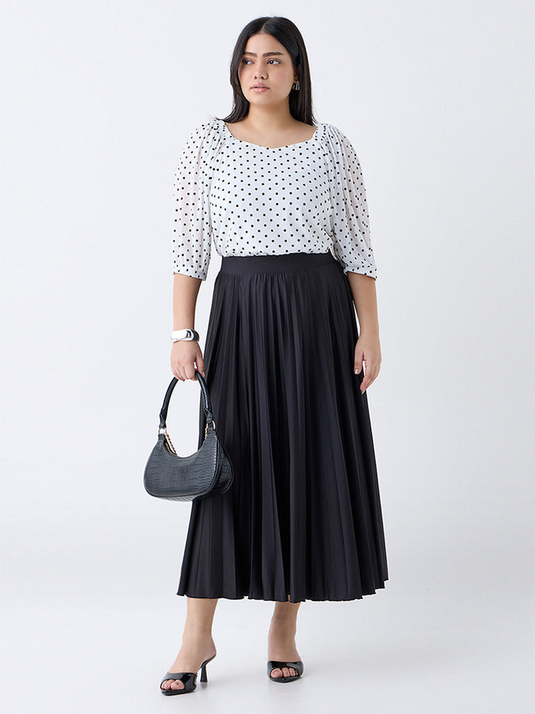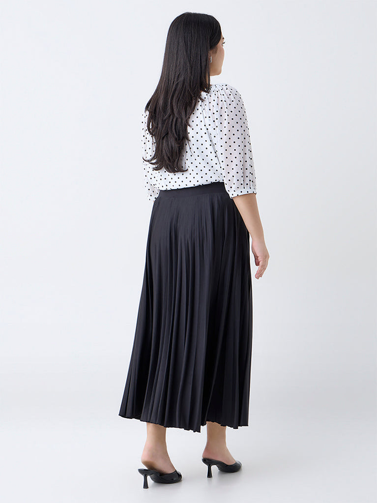 This black high-rise skirt from Gia features elegant accordion pleats that create a graceful flow with every movement. Made from a breathable fabric, it offers a comfortable fit enhanced by a smooth elastic waistband.