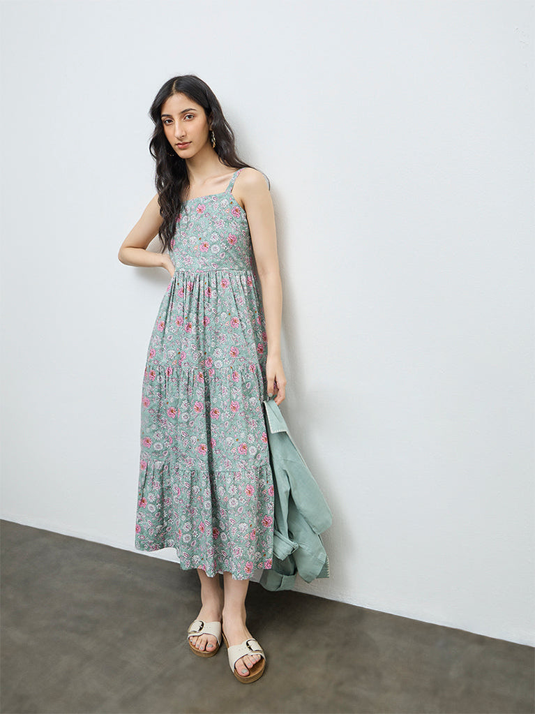 Bombay Paisley Green Printed Cotton Tiered Dress