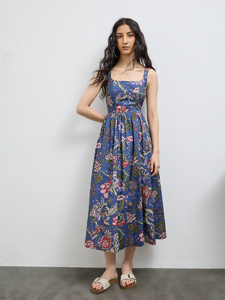 Bombay Paisley presents this blue floral dress designed with a square neckline and a sleeveless, strap-shouldered silhouette. A smocked back creates a cinched fit, while the A-line shape enhances volume and graceful movement. Crafted in a subtly textured fabric, it delivers a twirl-ready finish with an easy, feminine charm.