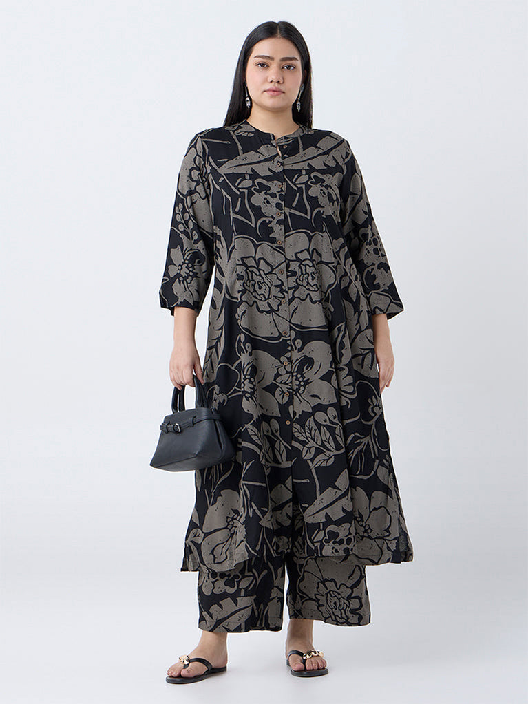 Diza presents this black A-line kurta adorned with a floral print for a timeless appeal. It features a band neck, button-down front, and three-quarter sleeves, along with practical side pockets. Crafted from a quality fabric, it ensures comfort with every wear.