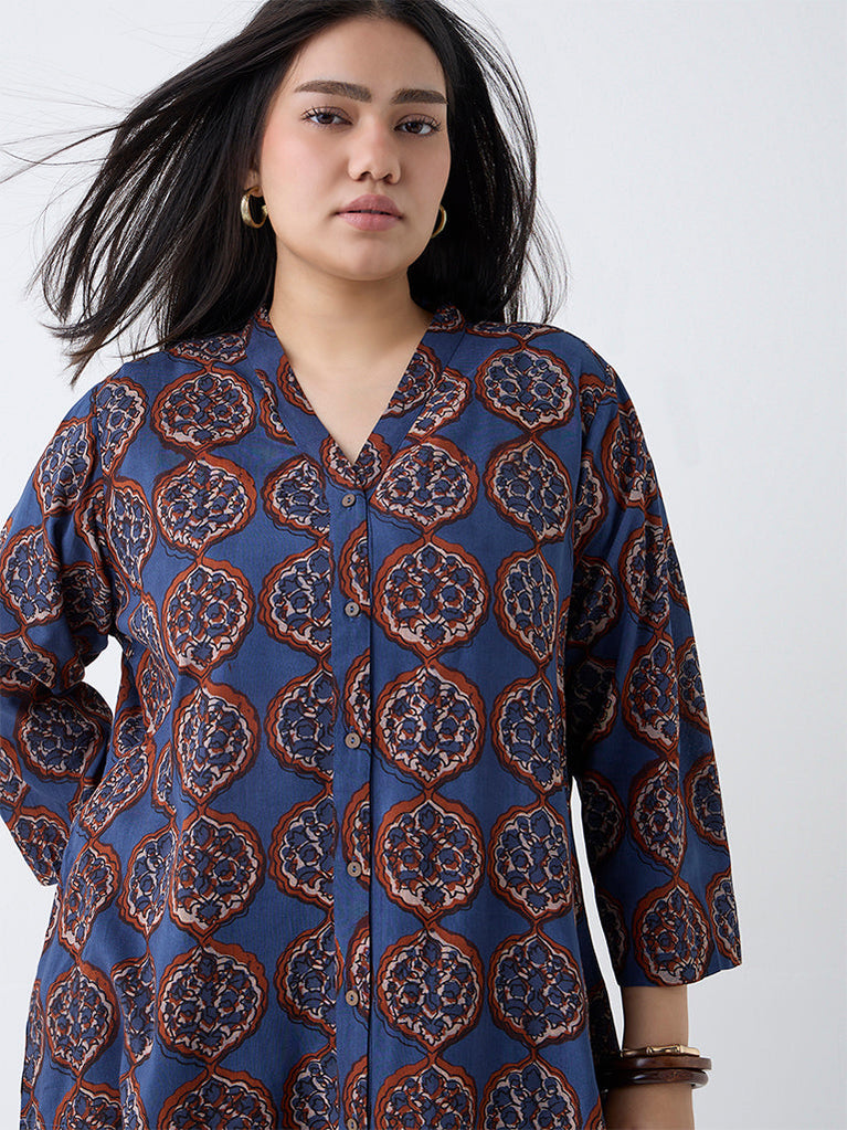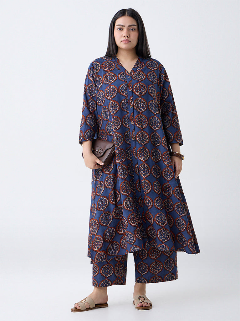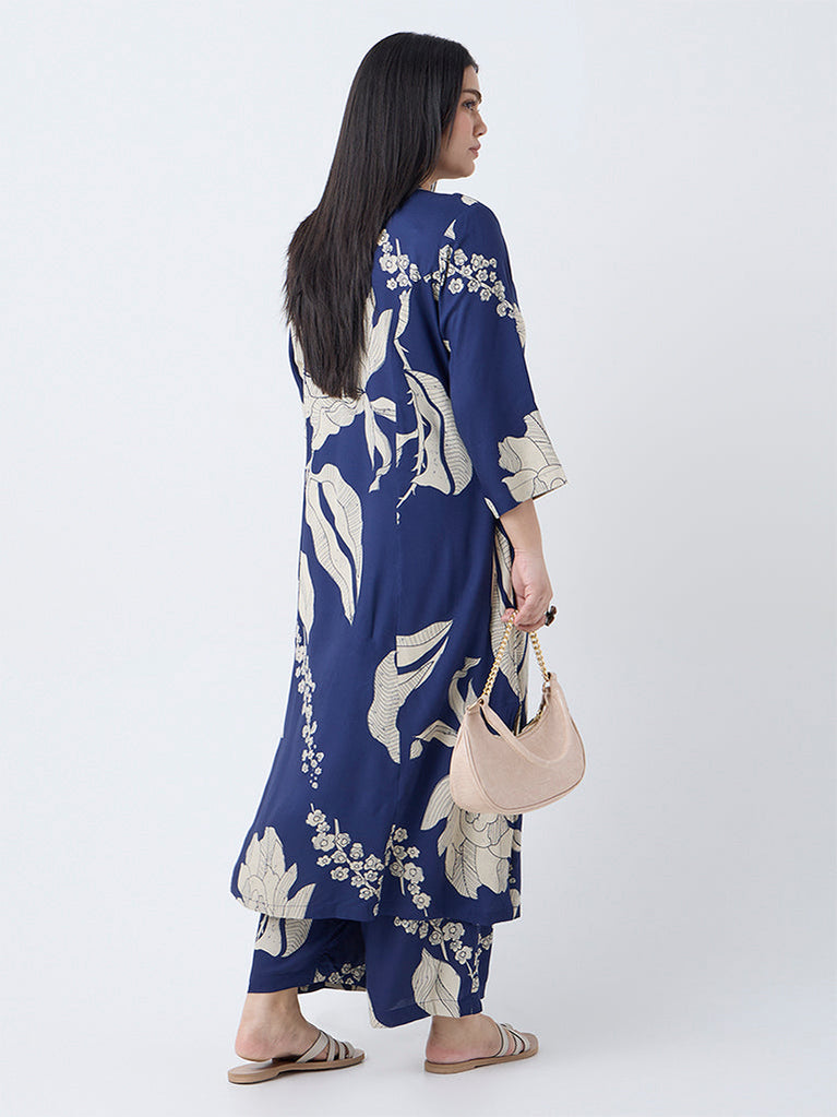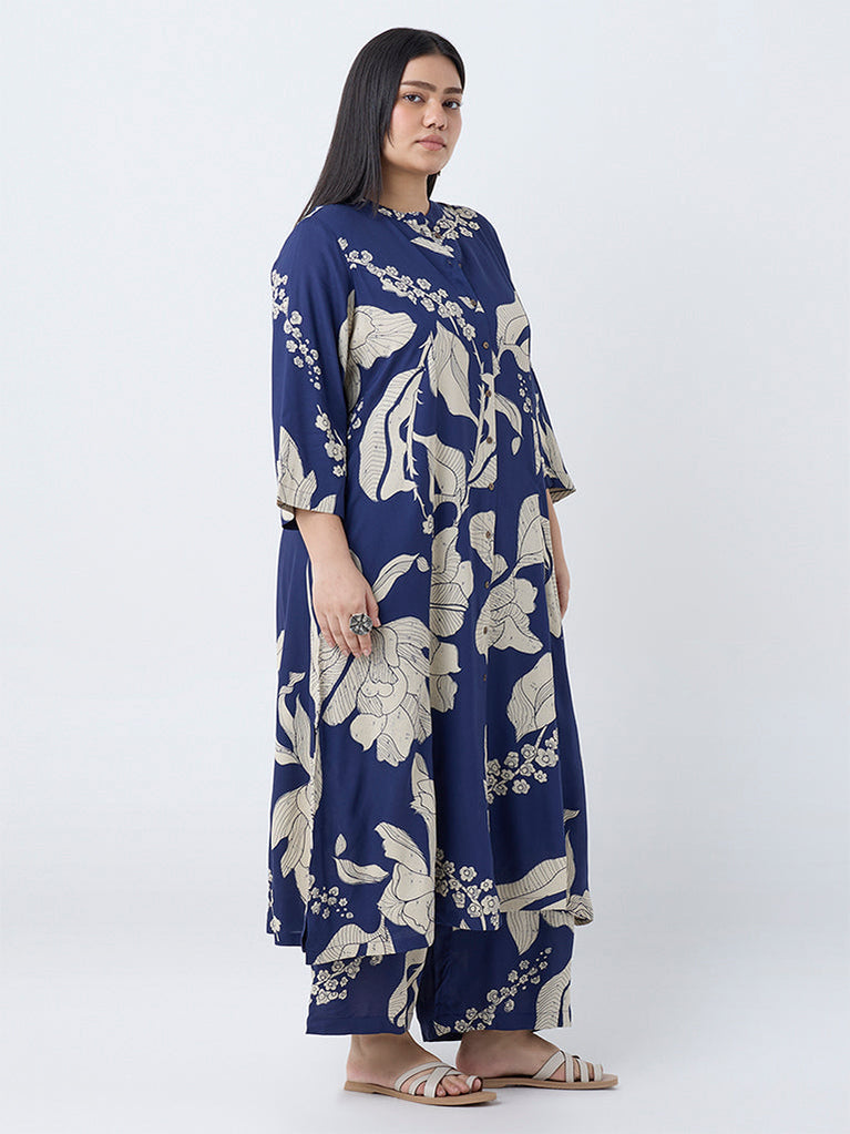 Diza presents this indigo A-line kurta adorned with a floral print for a timeless appeal. It features a round neck, button-down front, and three-quarter sleeves, along with practical side pockets. Crafted from a quality fabric, it ensures comfort with every wear.