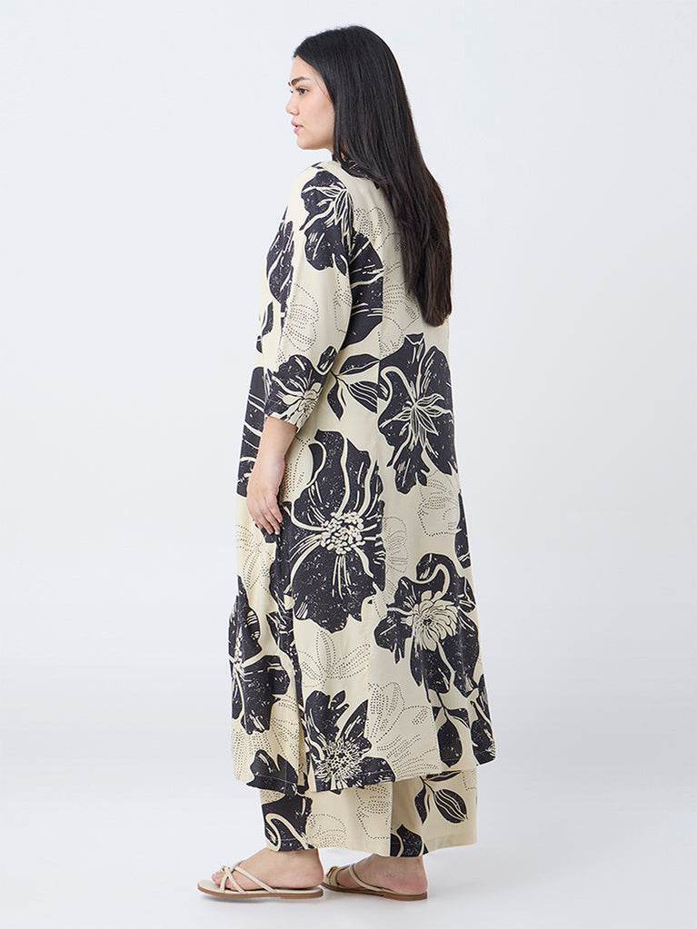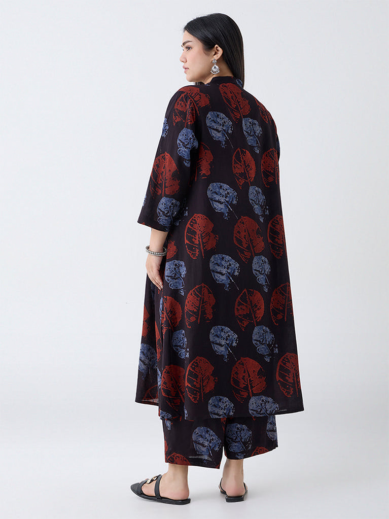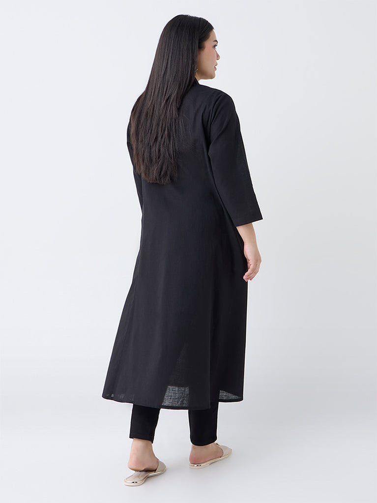 Diza Black Floral Embroidered Cotton A-Line Kurta