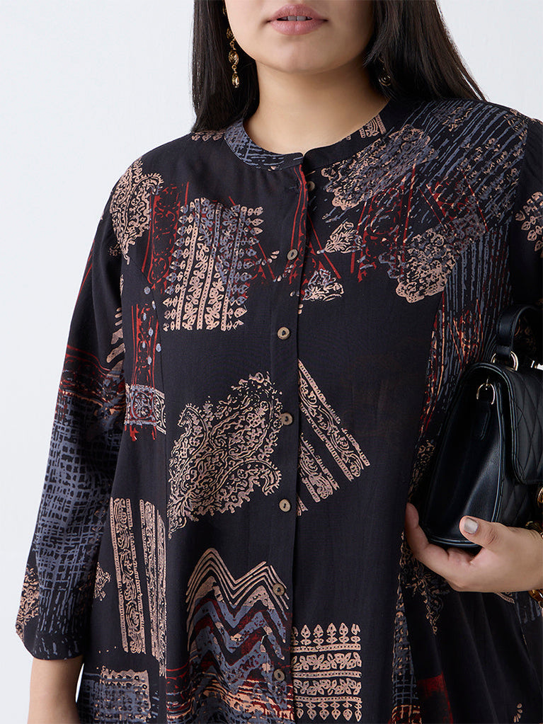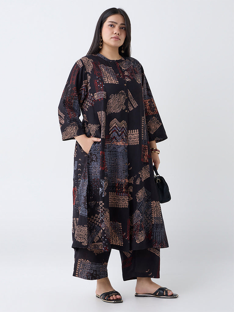 Designed to enhance your festive everyday style, this black kurta by Diza is fashioned with ethnic-inspired prints that feel elegant yet easy. Crafted from breathable fabric in an A-line silhouette, it features a mandarin collar, button placket and three-fourth sleeves. A slip pocket adds convenient practicality.