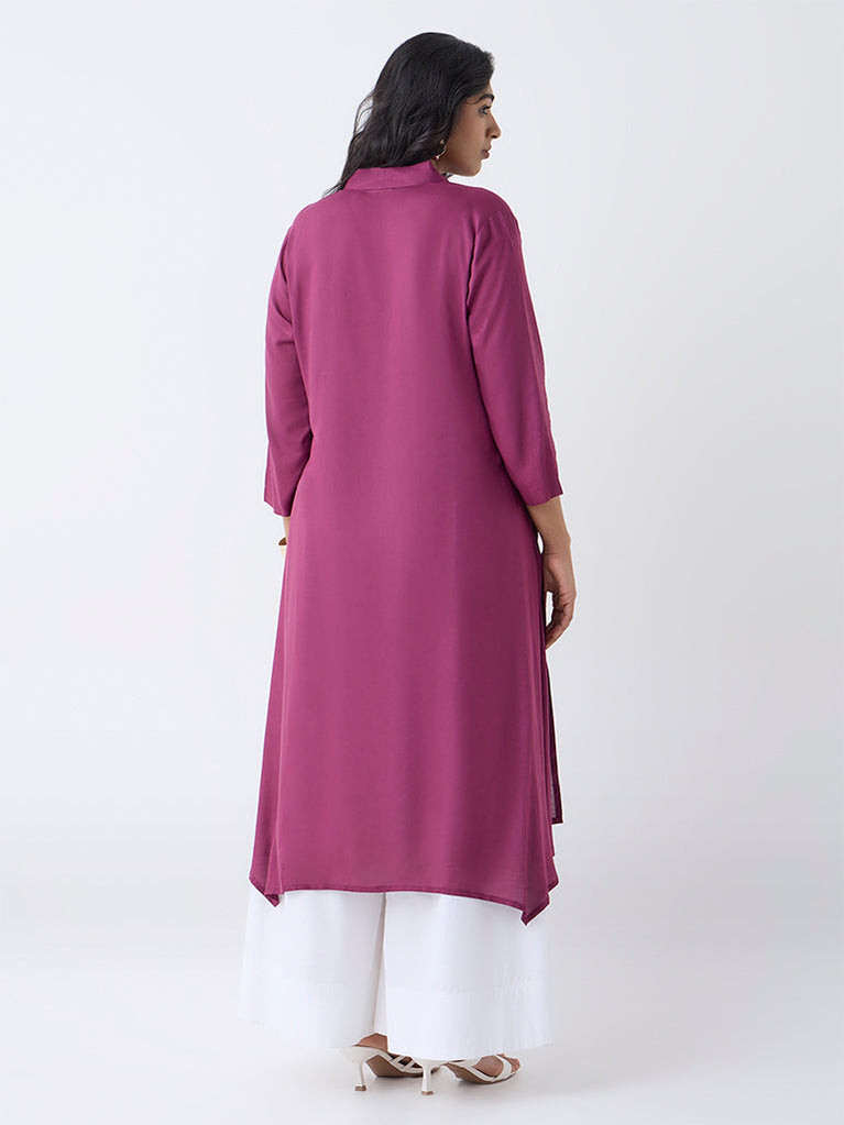 Crafted from lightweight fabric, this plum kurta from Diza blends tradition with simplicity. The floral motifs lend a soft festive appeal, while the A-line silhouette ensures an easy, flattering fit. It features a band collar that extends to a button placket and 3/4 sleeves for a refined finish. A side pocket adds function without compromising style.