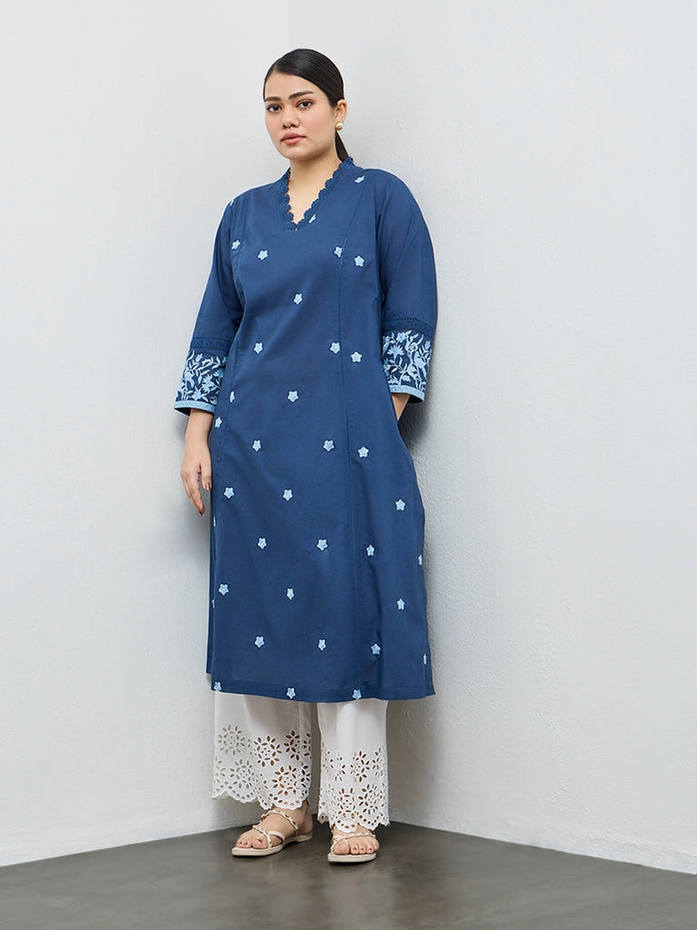 This indigo kurta from Diza is designed with an A-line silhouette for everyday ethnic dressing. Milled from a pure cotton fabric, it features a lace-trimmed V-neck and three-quarter sleeves that keep the look balanced. Floral motifs across the body brings a refined decorative finish while the side pockets brings a practical element.
