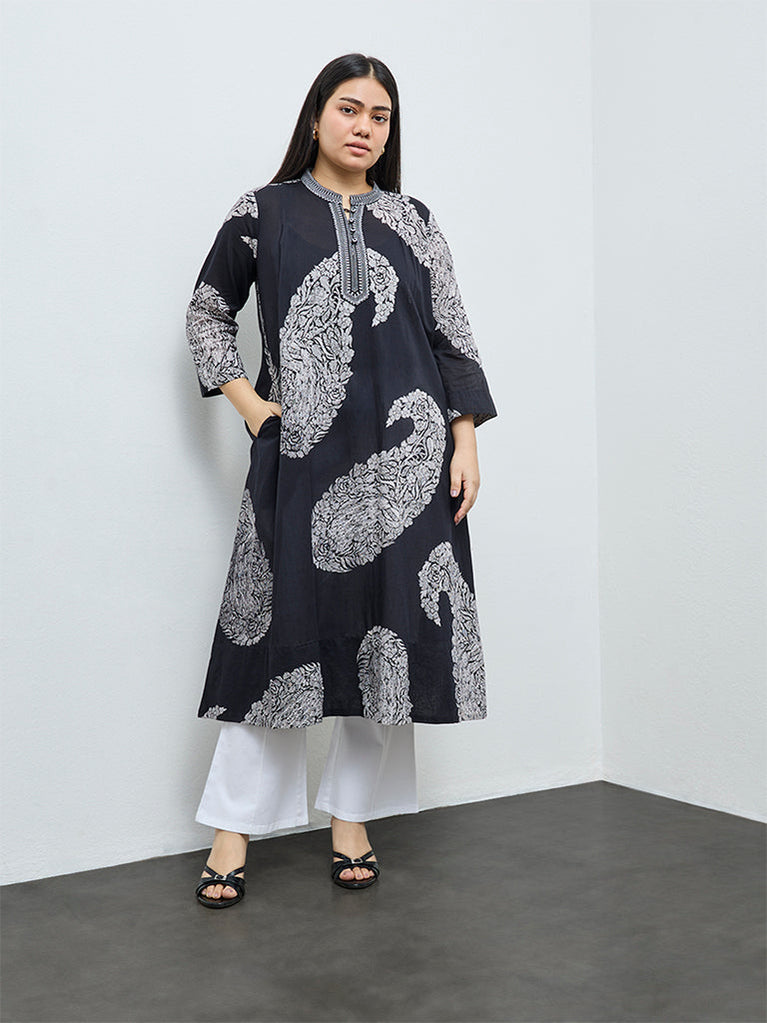 Rich in traditional character, this black kurta from Diza is crafted from a lightweight premium fabric that feels comfortable through long festive hours. The A-line silhouette is adorned with an all-over paisley print, while embroidery along the band collar and button placket adds a handcrafted touch. Finished with three-quarter sleeves, it is an elegant choice for celebrations, family gatherings, and cultural occasions.