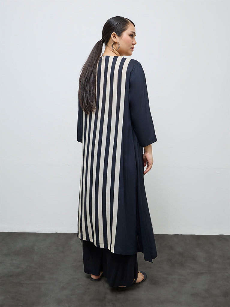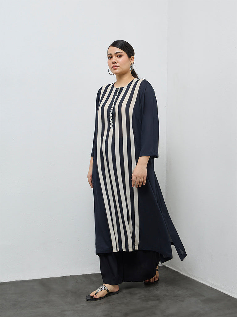 Texture takes the spotlight in this black kurta from Diza, detailed with all-over schiffli embroidery for a contemporary ethnic finish. An asymmetric neckline introduces visual interest, while the A-line silhouette ensures a flattering drape. Lightweight and breathable, it is completed with full sleeves and a discreet slip pocket.