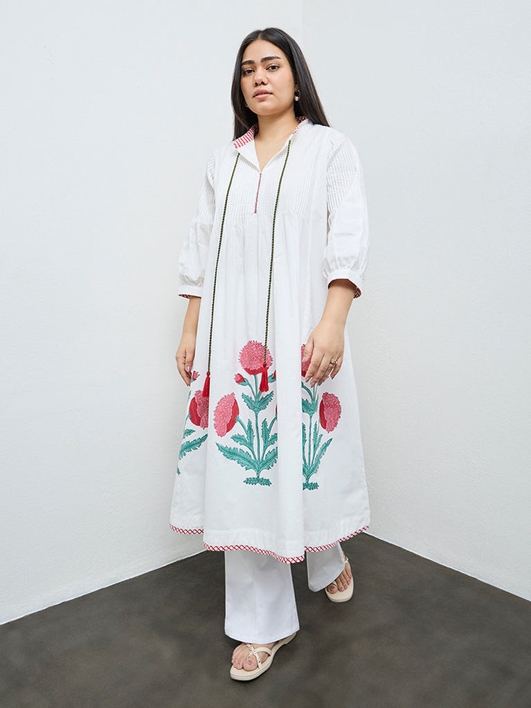 Diza White Floral Embroidered Cotton A-Line Kurta