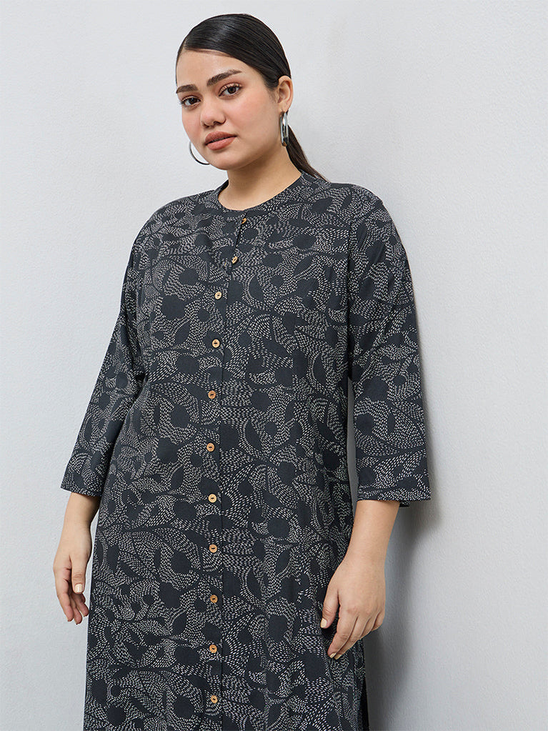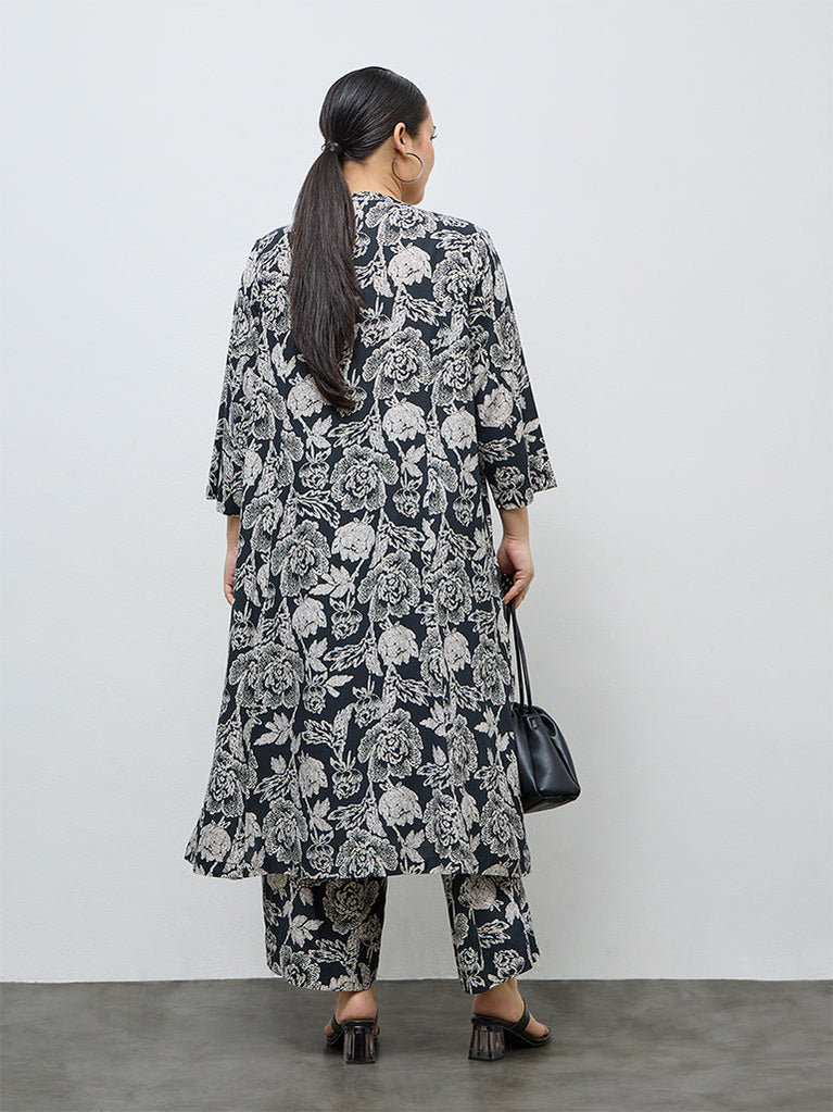 Designed to flatter with effortless structure, this black kurta from Diza is adorned with a foliage-inspired print across the front for a refined ethnic appeal. Crafted from a breathable fabric, it features a collared neckline that extends into a buttoned placket, offering clean definition through the bodice. Full sleeves provide balanced coverage, while discreet side pockets add everyday functionality.