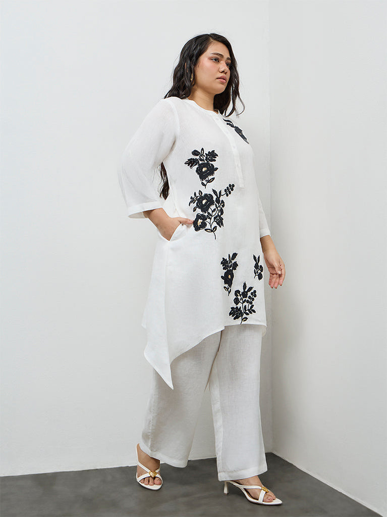 This white kurta from Diza features textured details on an A-line silhouette, elevating the traditional appeal. It is crafted from a pure cotton fabric that allows ease of movement through the day. A V-neck and three-quarter sleeves decorated with floral embroidery defines the shape, while side pockets add a practical element.