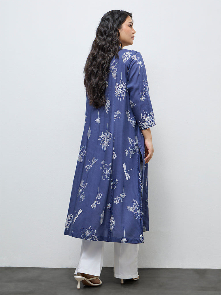 Diza Indigo Floral Embroidered Cotton A-Line Kurta