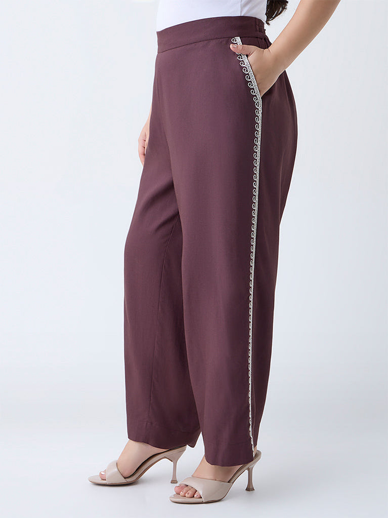 Dark brown Pants by Gia, elevated with intricate side embroidery that adds a refined, elongating effect to the silhouette. Cut from a breathable fabric that moves effortlessly with you, they feature an elasticated waistband for all-day comfort and side pockets for everyday practicality.