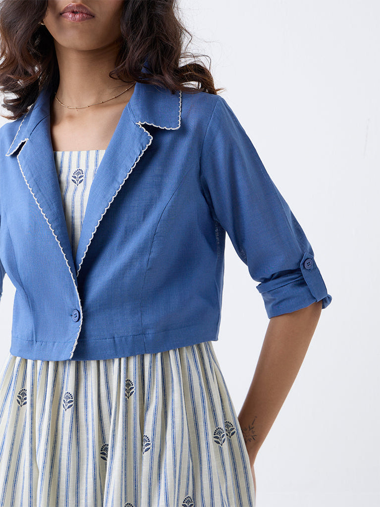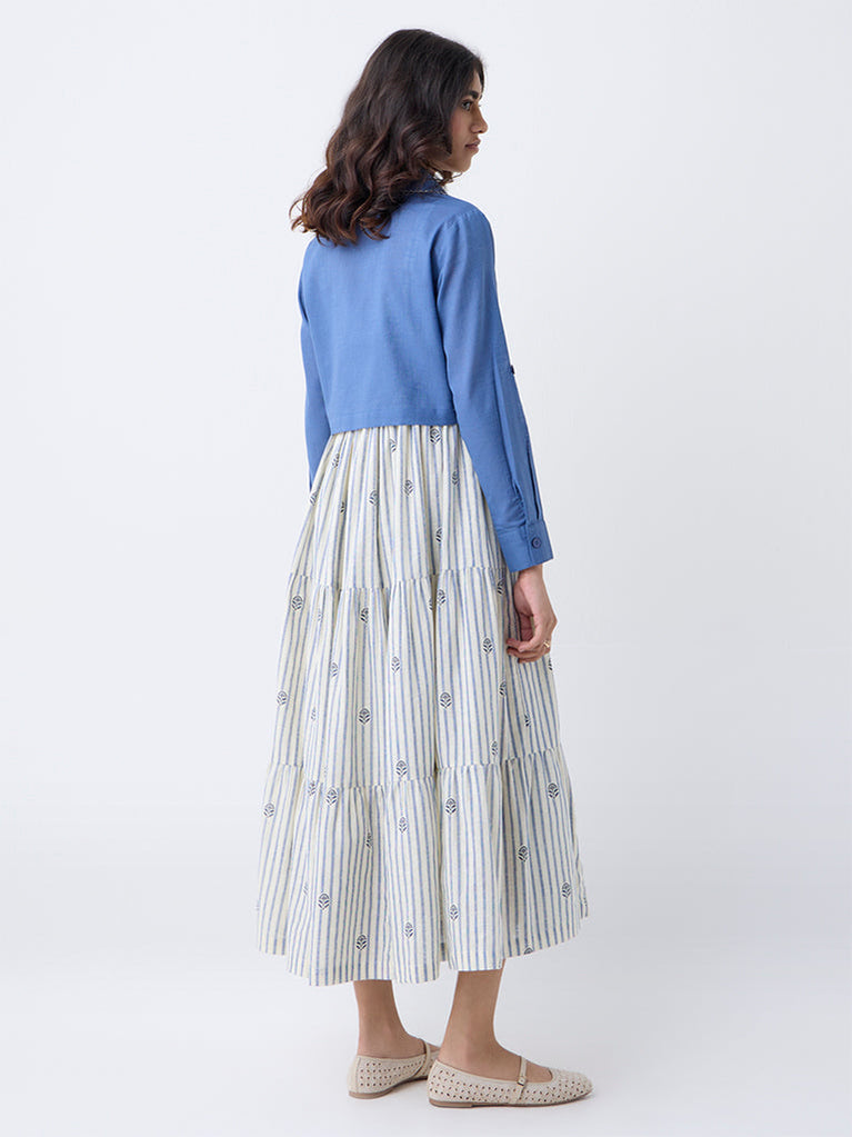 Perfect for slow mornings and sun-soaked afternoons, this blue dress set from Bombay Paisley brings together bold stripes and soft floral accents in a tiered silhouette. Designed with a square neckline, adjustable straps and a smocked back, it offers ease without compromising on style. Crafted from breathable pure cotton, the dress feels light and effortless, while the matching solid jacket adds a layered finish for outdoor-ready styling.