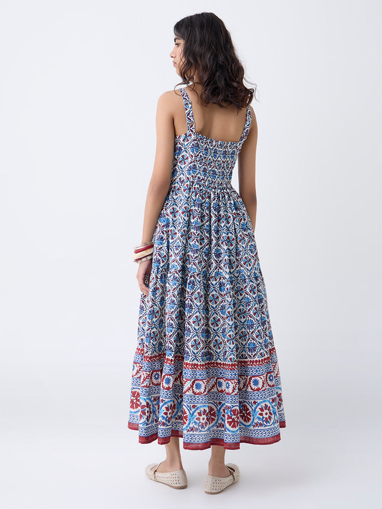 For days that move from morning errands to evening strolls, this blue dress from Bombay Paisley offers effortless charm. Designed in pure cotton, it showcases an all-over floral print on an A-line silhouette with a scoop neckline, adjustable straps and a button-up front. The smocked back ensures comfort and ease, making it a dependable choice for outdoor wear.