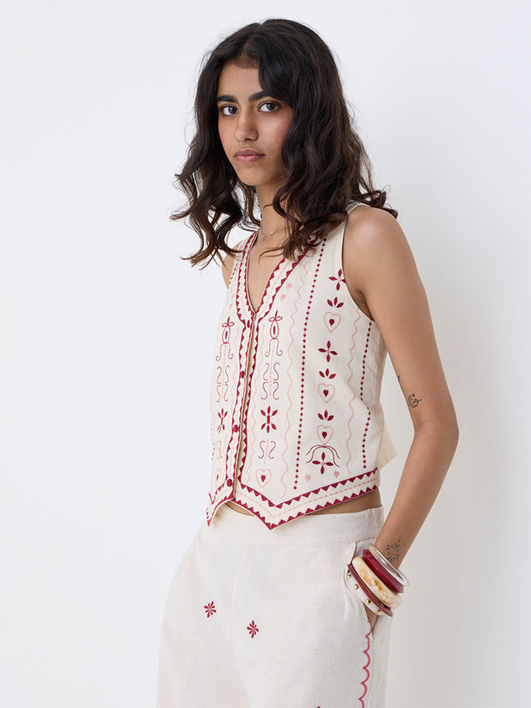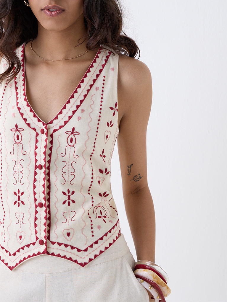 Made to be the focal point of your look, this Off-White waistcoat from Bombay Paisley is detailed with vivid embroidery for a structured yet artisanal appeal. Shaped with a V-neckline, button-up front and a sleeveless silhouette, it is crafted from a cotton-blend fabric that stays comfortable while adding definition to layered outfits.