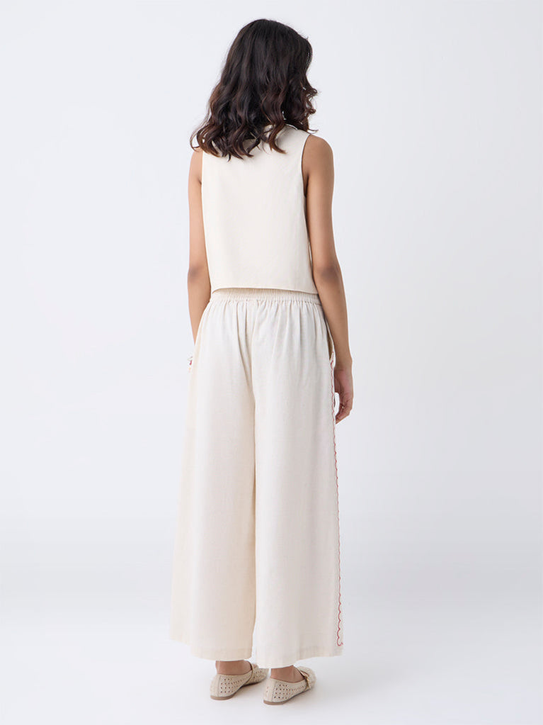 These off-white pants from Bombay Paisley redefine everyday dressing. Crafted for comfort with side pockets and an elasticated waistband featuring a button-zip fly, they’re finished with a braided leather belt that adds a touch of earthy sophistication.