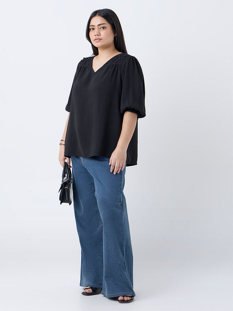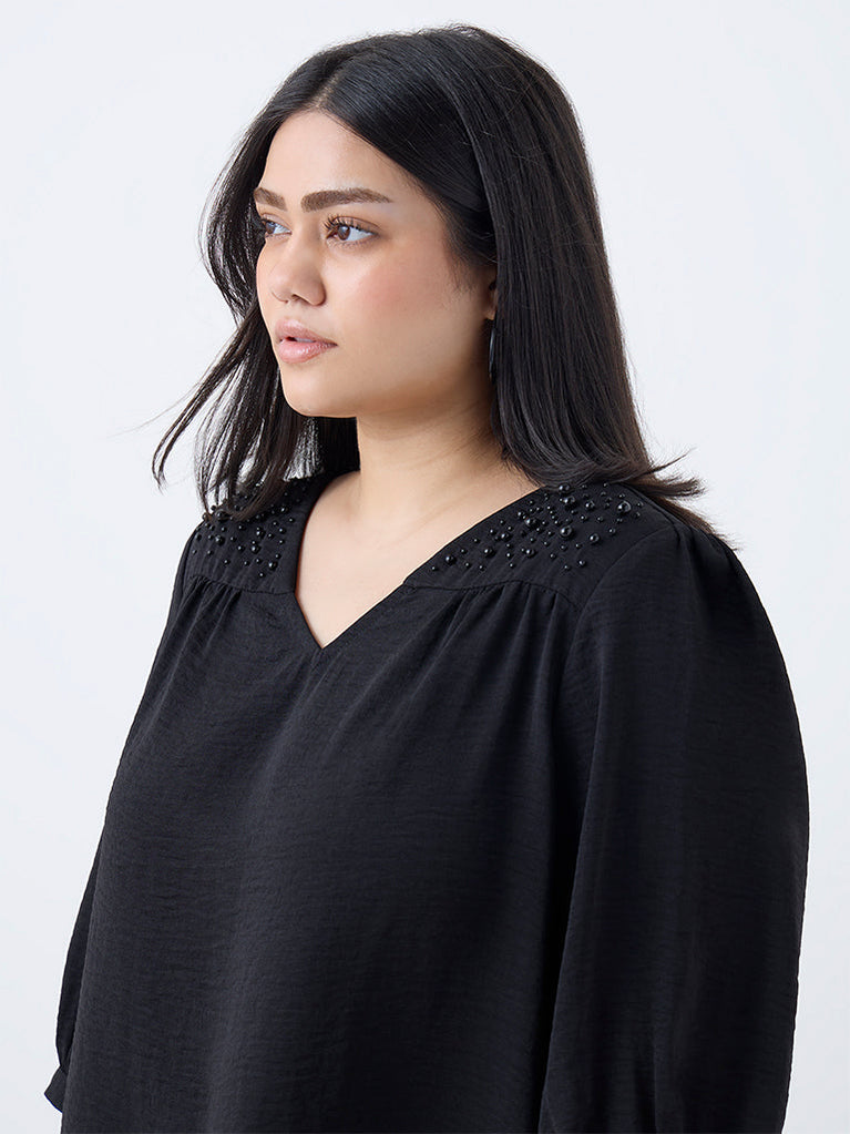 Elevate your everyday style with this elegant black blouse from Gia, adorned with delicate pearl detailing that frames the V-neck beautifully. The three-quarter sleeves and soft crinkled texture add depth and movement, making it a graceful choice for both casual and dressy occasions.
