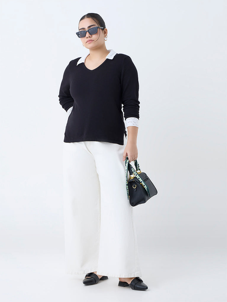This black sweater from Gia is designed to take you from desk to dinner with quiet sophistication. Defined by its lace-detailed V-neck collar and cuffs, it is crafted from quality fabric and finished with full sleeves.