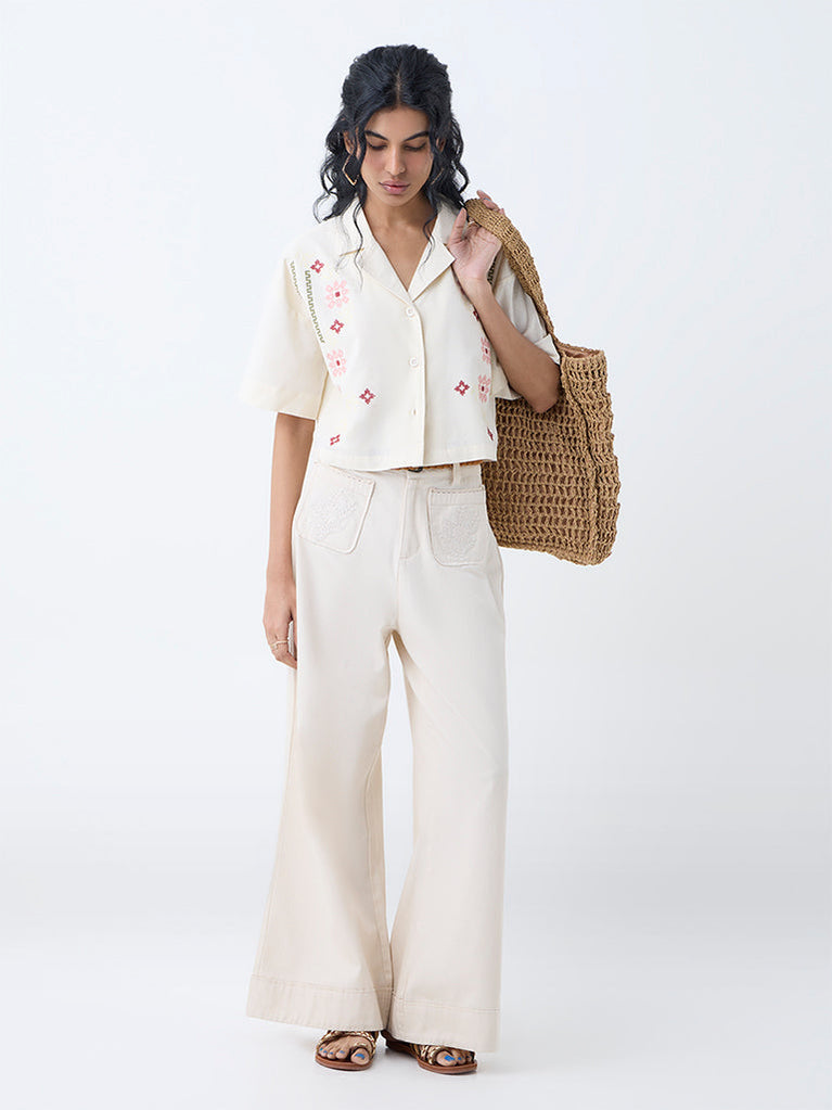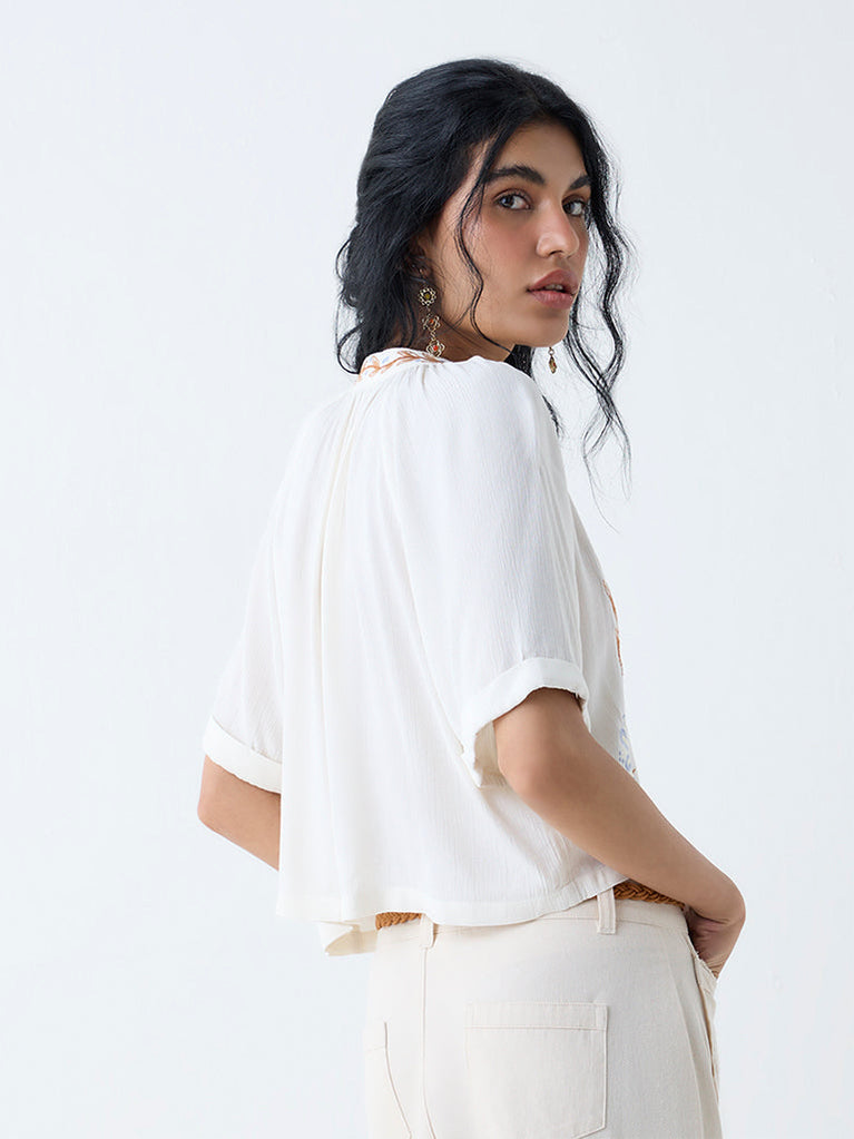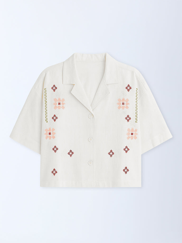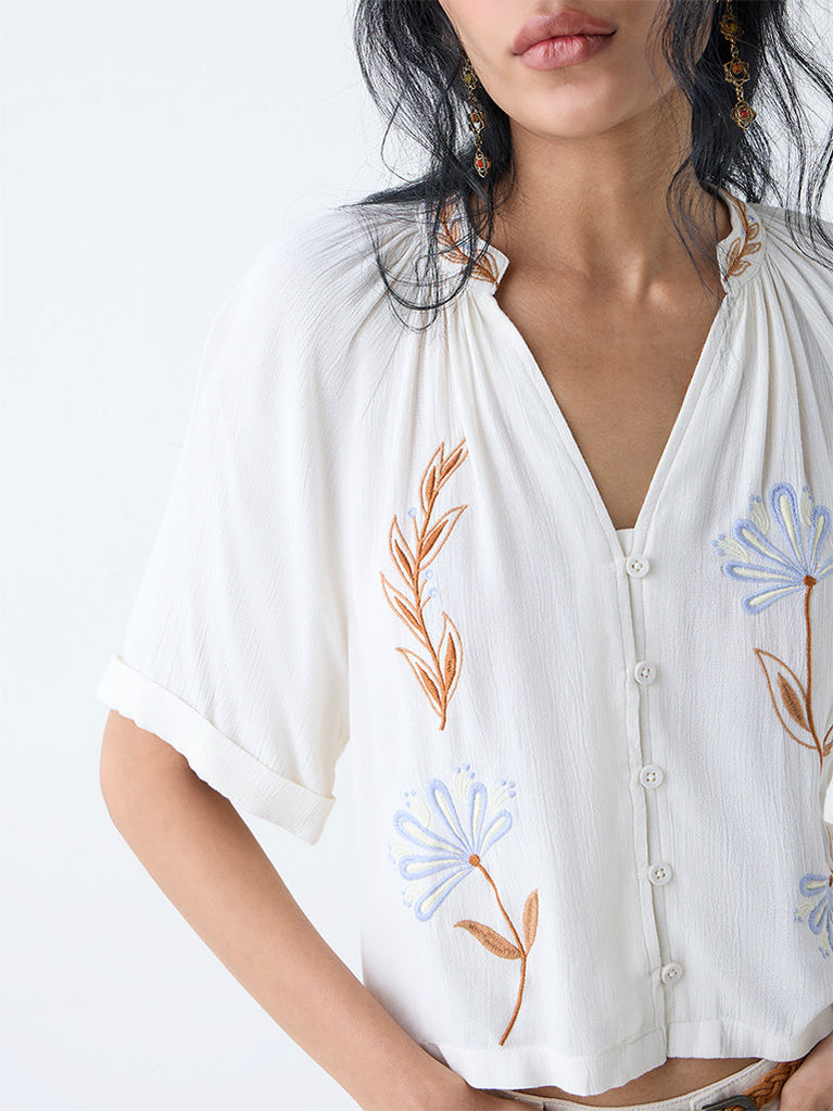 Bring sophisticated charm to your outdoor wardrobe with this off-white top from Bombay Paisley. Adorned with floral embroidery on the front, it’s made from pure cotton and styled with a notched neck that extends to a button placket and short sleeves.