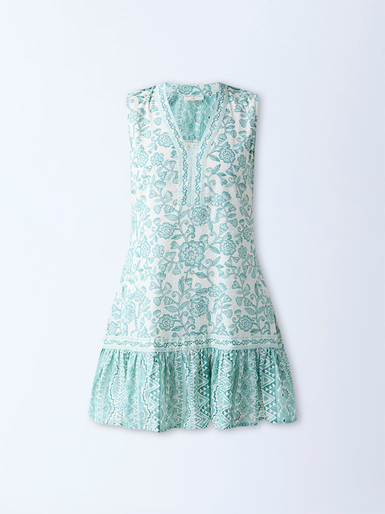 Embrace effortless feminine style with this green dress from Bombay Paisley. Patterned with lively floral prints in an easy A-line silhouette, it’s finished with a flattering V-neck and sleeveless cut. Woven from pure cotton with side pockets, it pairs breezy comfort with practical utility.